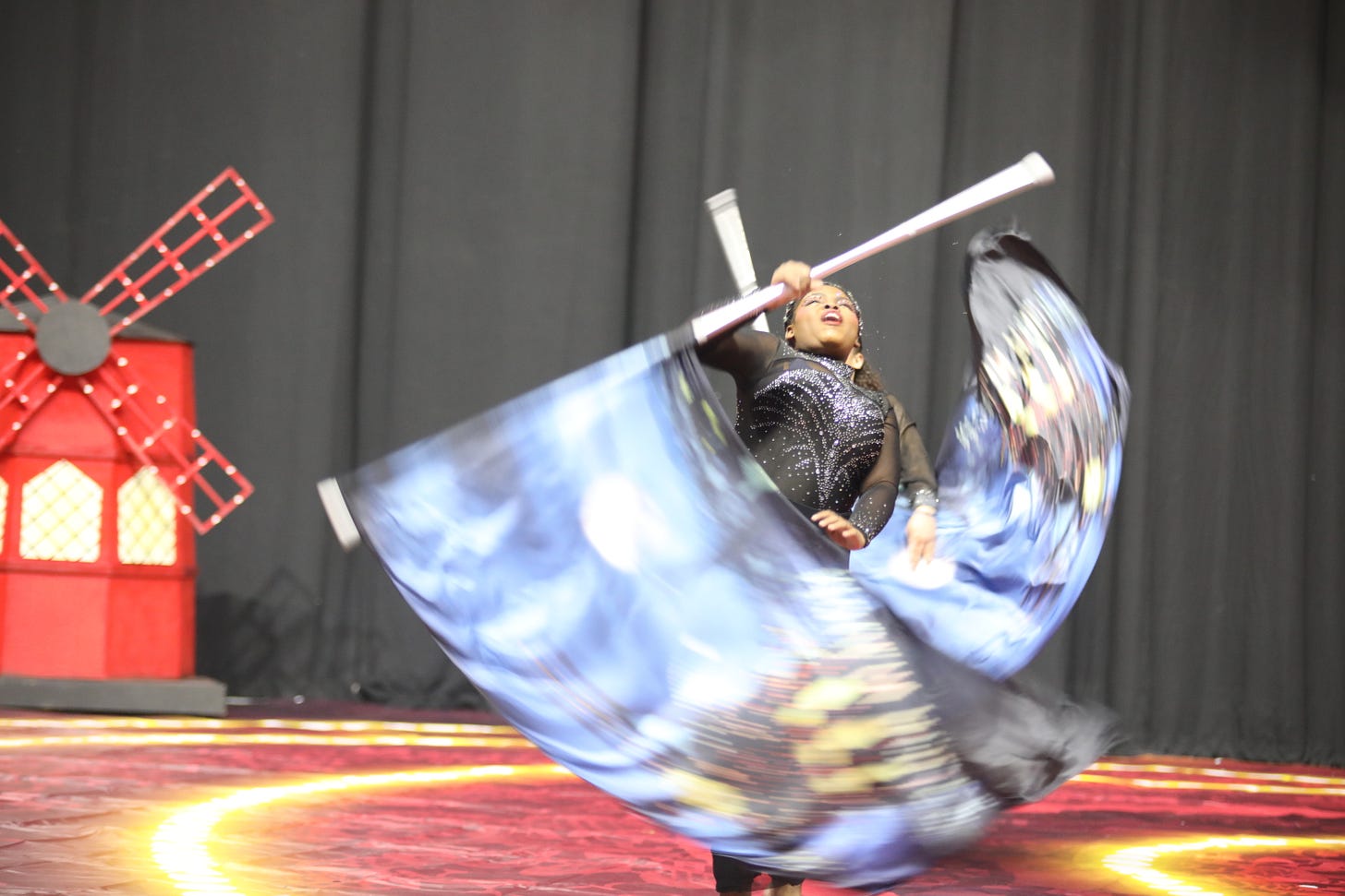 Often described as the most theatrical of the three, Winter Guard combines dance, movement, and equipment work using flags, rifles, and sabers. Performances take place on a large tarp that transforms the gym floor into a stage, with costuming, props, and music creating a fully realized visual production.