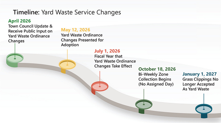 The longer-term change is structural. Yard waste carts would be delivered in May and June of 2028, with containerized collection beginning shortly after July 4th. Staff said the move is intended to standardize service, reduce the amount of material entering stormwater systems, and improve neighborhood appearance, while aligning with the town’s sustainability goals.