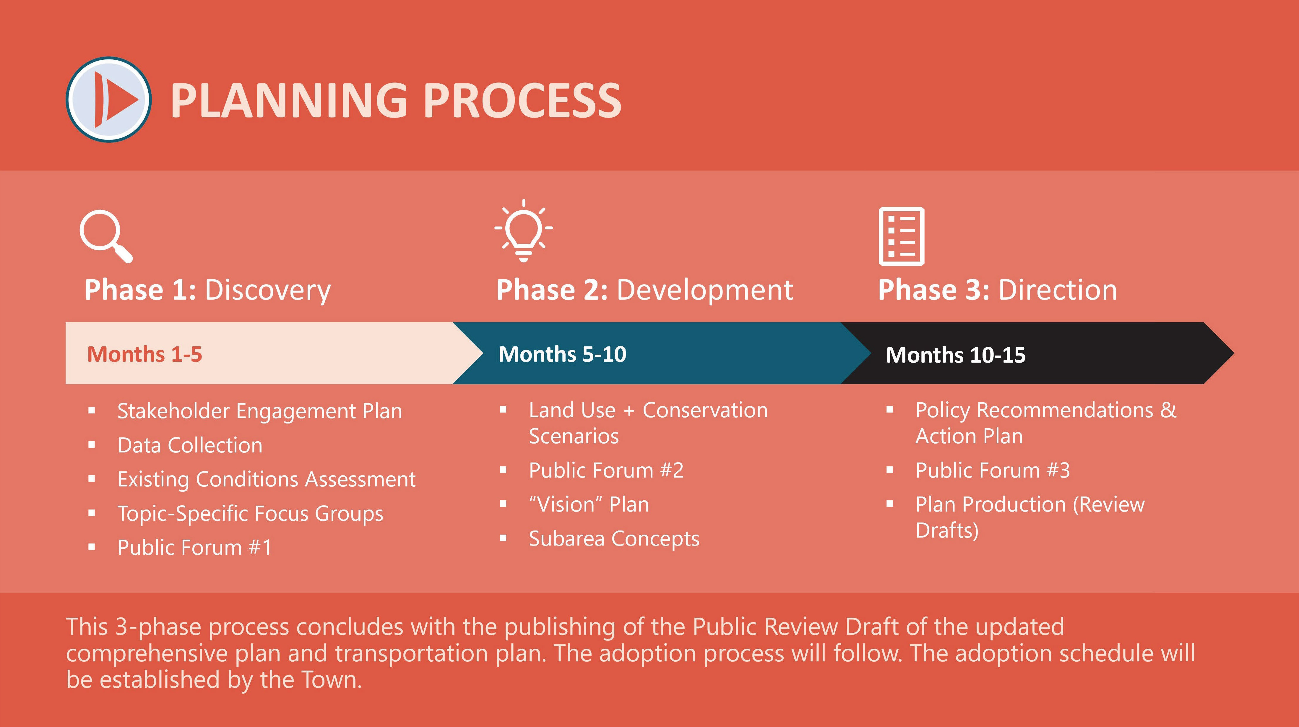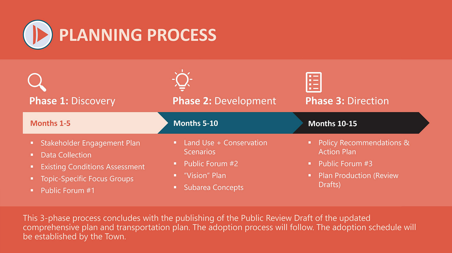 Much of the afternoon’s work session was devoted to guiding council members through how public input is incorporated into each phase, particularly as the town prepares to evaluate different long-term growth scenarios.