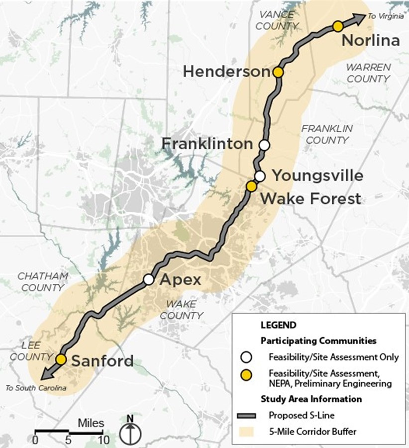The Apex Mobility Hub (document) is part of a broader state and regional effort to prepare for future passenger rail service along the S-Line (link), a rail corridor stretching from Richmond, Virginia, to Raleigh, North Carolina. The North Carolina Department of Transportation envisions “mobility hubs” as multimodal centers where passenger rail, buses, bicycles, and pedestrians converge in one location, making it easier for people to travel without relying solely on cars. In Apex, the hub would not only serve as a train station, but also as a central connection point for bus routes, bike trails, and walking paths. The concept comes out of a feasibility study and public engagement process that examined potential sites, connections to existing infrastructure, and ways to stimulate transit-oriented development while preserving Apex’s small-town character.