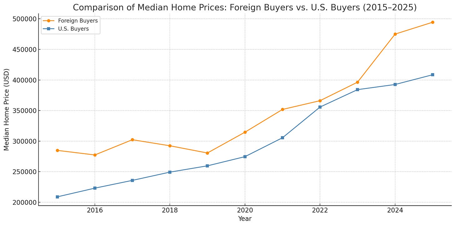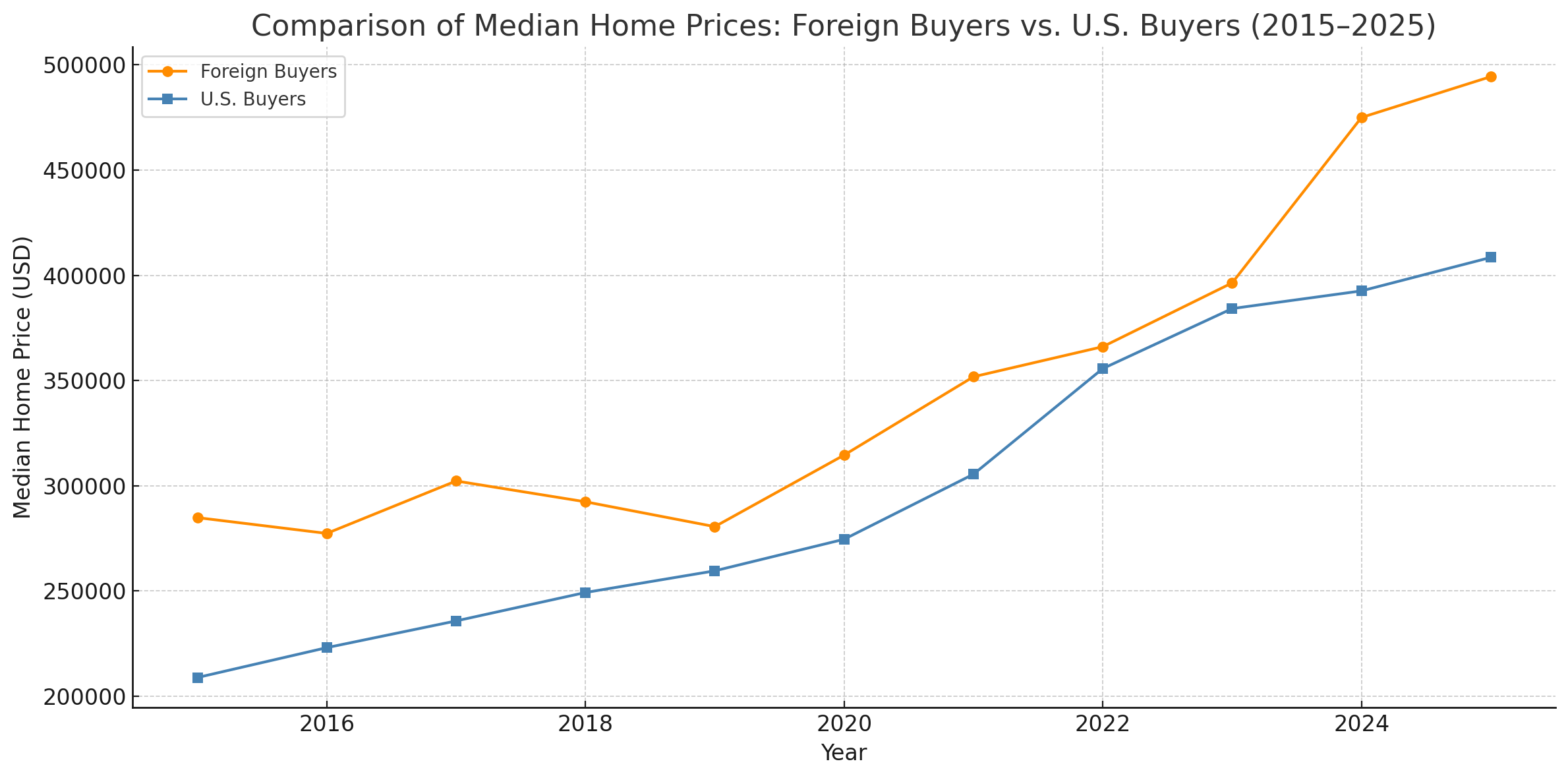 Foreign buyers, who often arrive with substantial capital, are purchasing U.S. homes at a pace and price point that increasingly distinguishes them from domestic buyers.