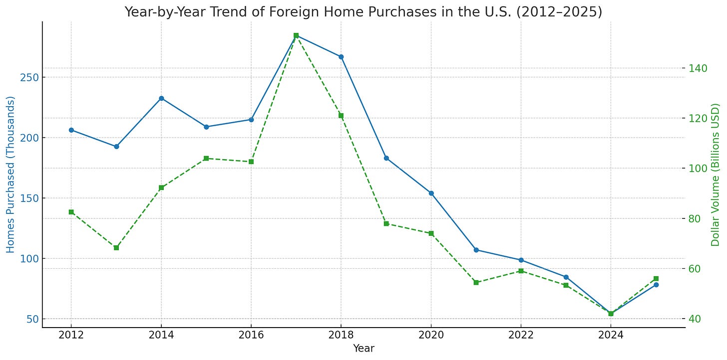 Foreign buyers purchased an estimated 78,100 homes in the United States between April 2024 and March 2025. That marks a 44% jump in volume from the previous year.