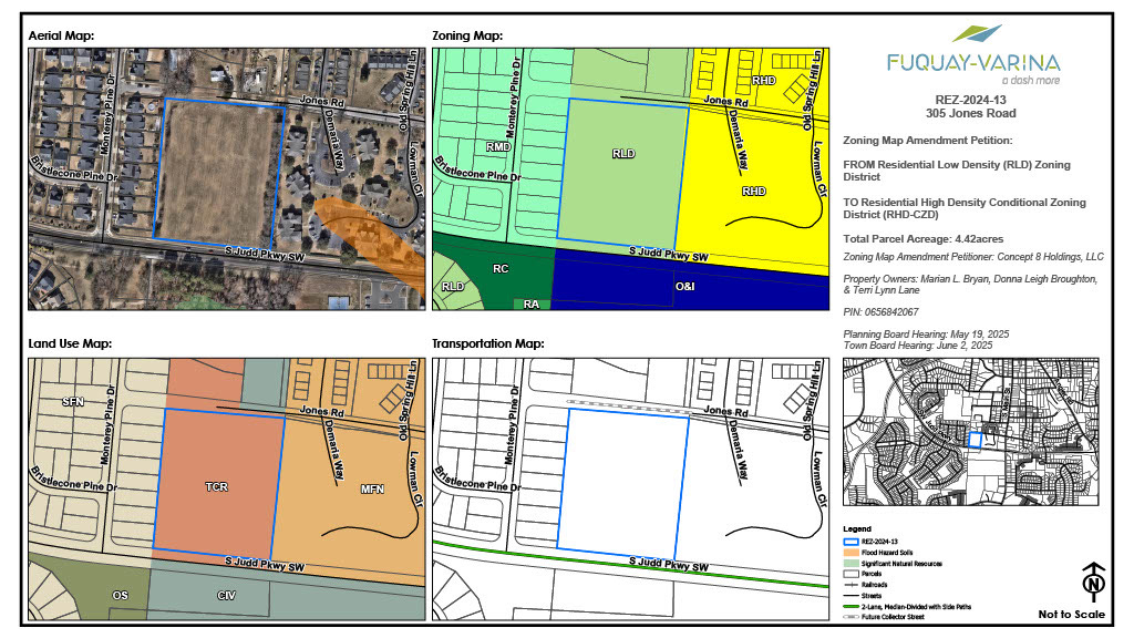 Commissioners approved a rezoning and land-use plan amendment for 305 Jones Road, a 4.42-acre vacant site that will be developed into 41 townhomes by Concept 8 Holdings, LLC. The site, located within the Judd Parkway loop, was reclassified from low-density residential to high-density conditional zoning and from Town Center Residential to Multi-Family Neighborhood in the town’s long-range land-use plan.