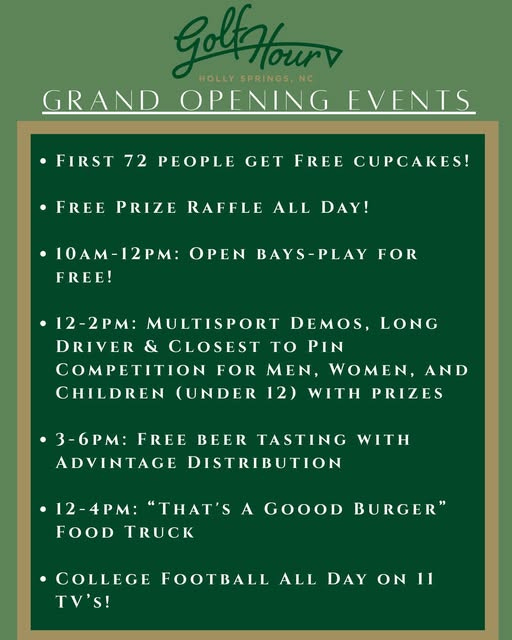 Holly Springs, NC, Aug. 21, 2025 — Holly Springs has a new destination for golf enthusiasts and sports fans alike. Golf Hour, located at 131 Oakview Commons Drive, officially celebrates its grand opening on Saturday, August 23, 2025, with a full day of events, competitions, and community activities. The festivities start at 10:00 a.m. and run until 10:00 p.m.
