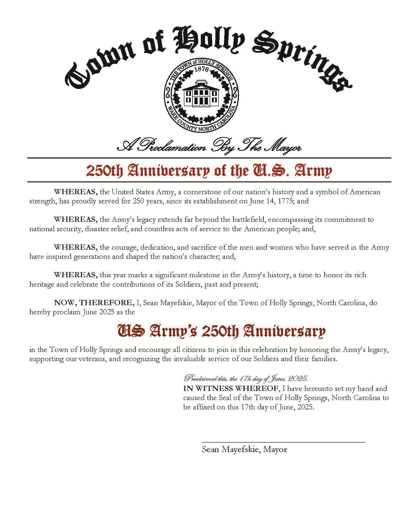 “Now, therefore, I do proclaim that June 2025 is the United States Army’s 250th anniversary, and in the Town of Holly Springs, I encourage all its citizens to join in the celebration of this honor by supporting its veterans and recognizing the invaluable service of these soldiers and their families.”