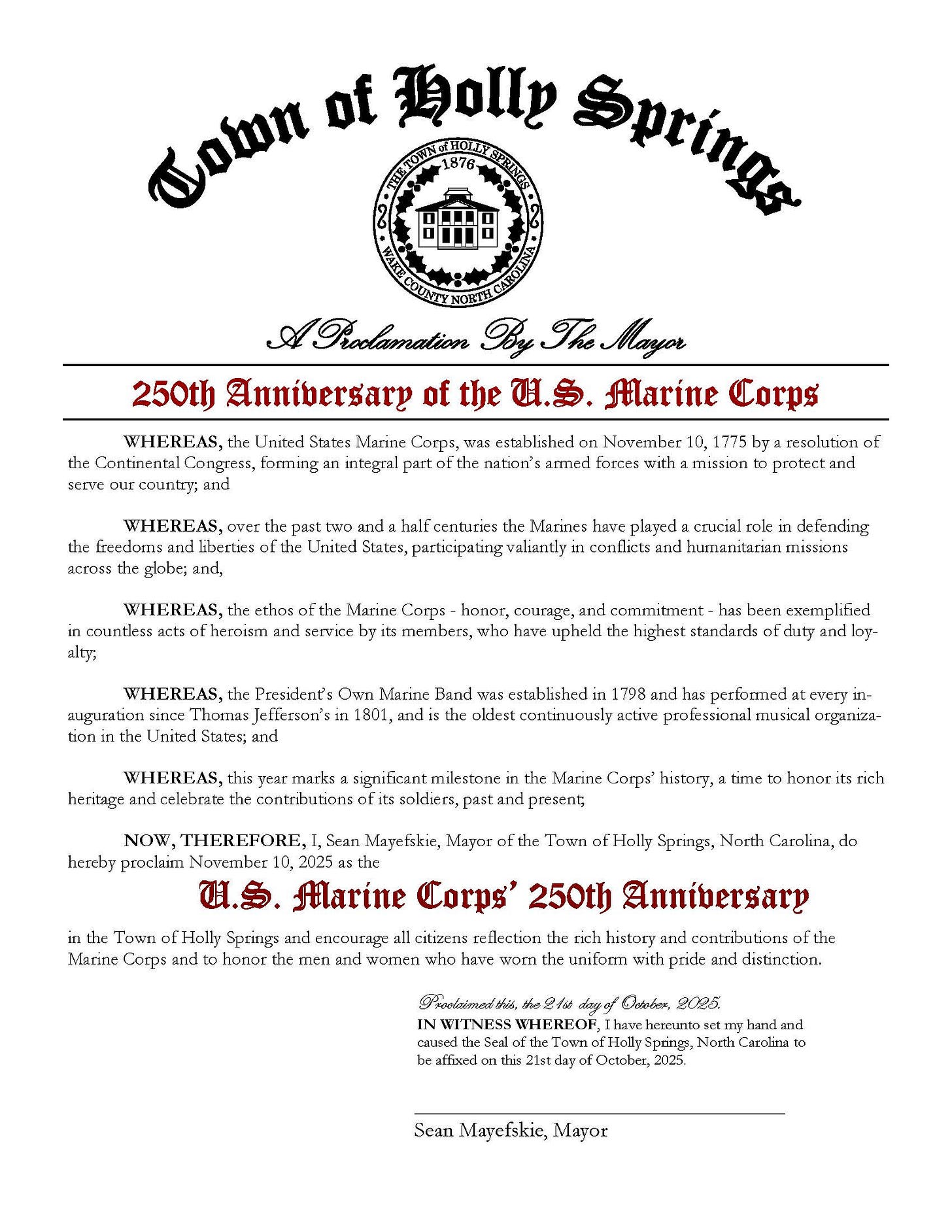 Holly Springs, NC, Oct. 23, 2025 — At its October 21st meeting, the Holly Springs town council issued a proclamation honoring and celebrating the 250th anniversary of the United States Marine Corps (learn more).