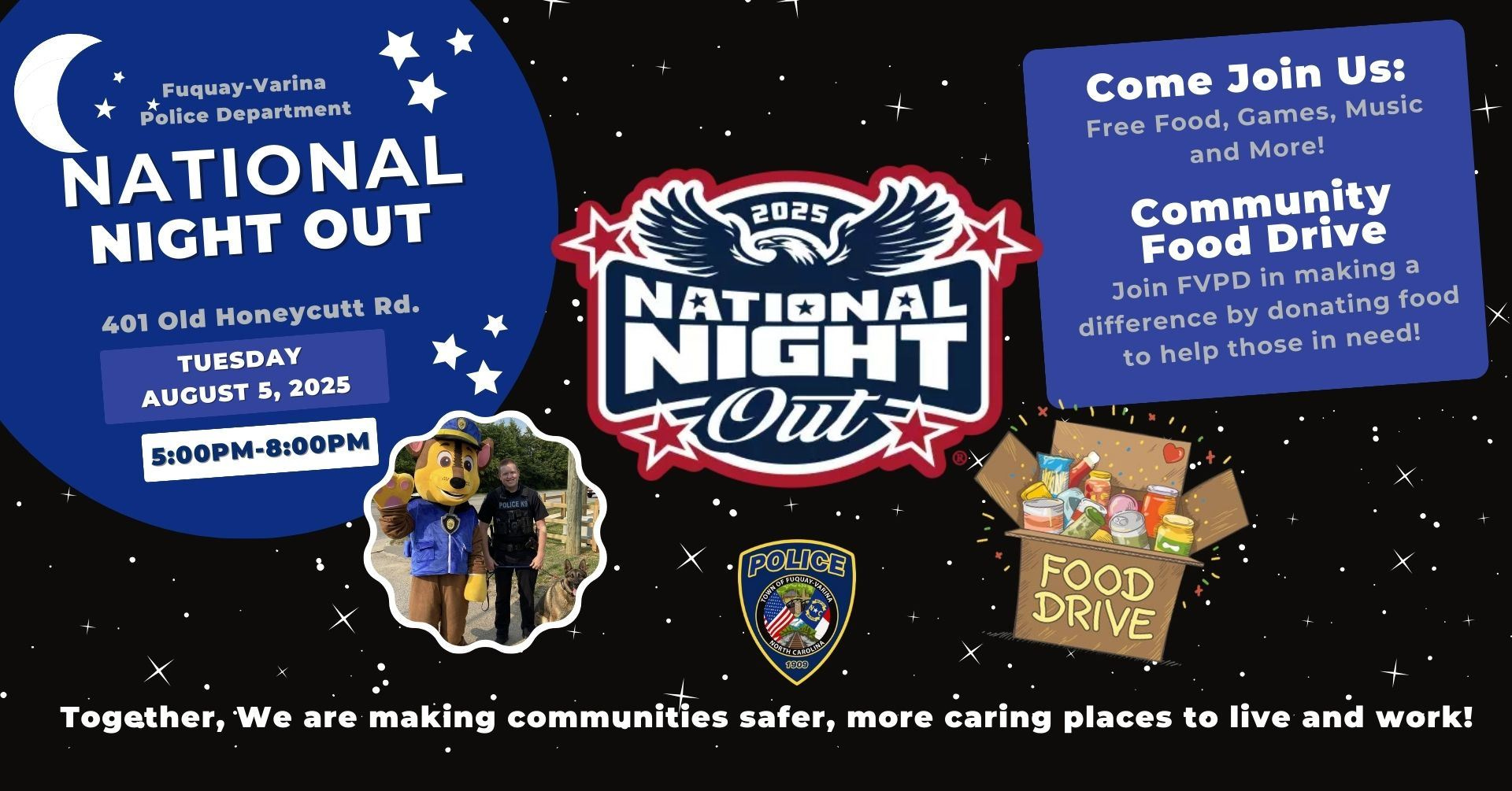 The Fuquay-Varina Police Department will host its National Night Out on Tuesday, August 5, from 5:00 to 8:00 PM at 401 Old Honeycutt Road. This year’s festivities include: