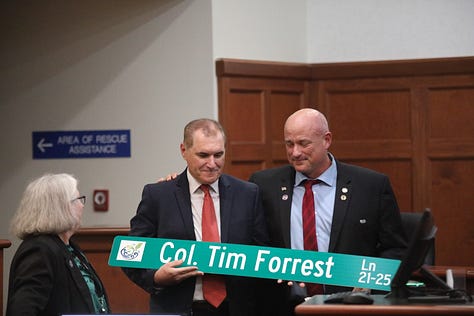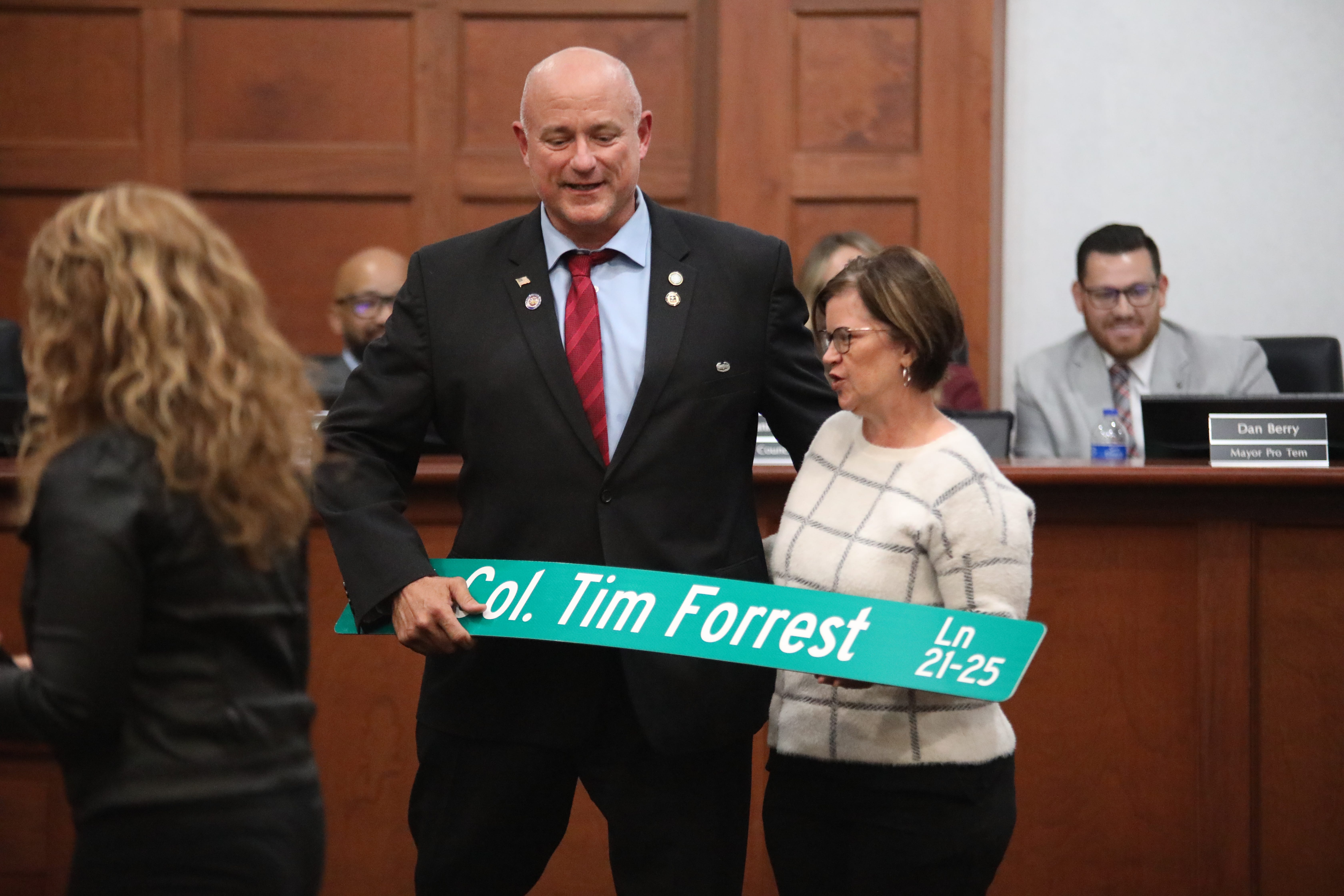 Outgoing Council Member and Colonel Tim Forrest, USA, Ret. spoke first, delivering a steady, reflective farewell rooted in his decades of military service. He told the packed chambers that he approached his four-year term with the same principles he brought from the Army: “serve with purpose, lead with integrity, leave things better than you found them.” Forrest highlighted the challenges and accomplishments of a rapidly growing town, major road and safety projects, strengthening long-term infrastructure planning, and balancing development pressures with the community’s needs.