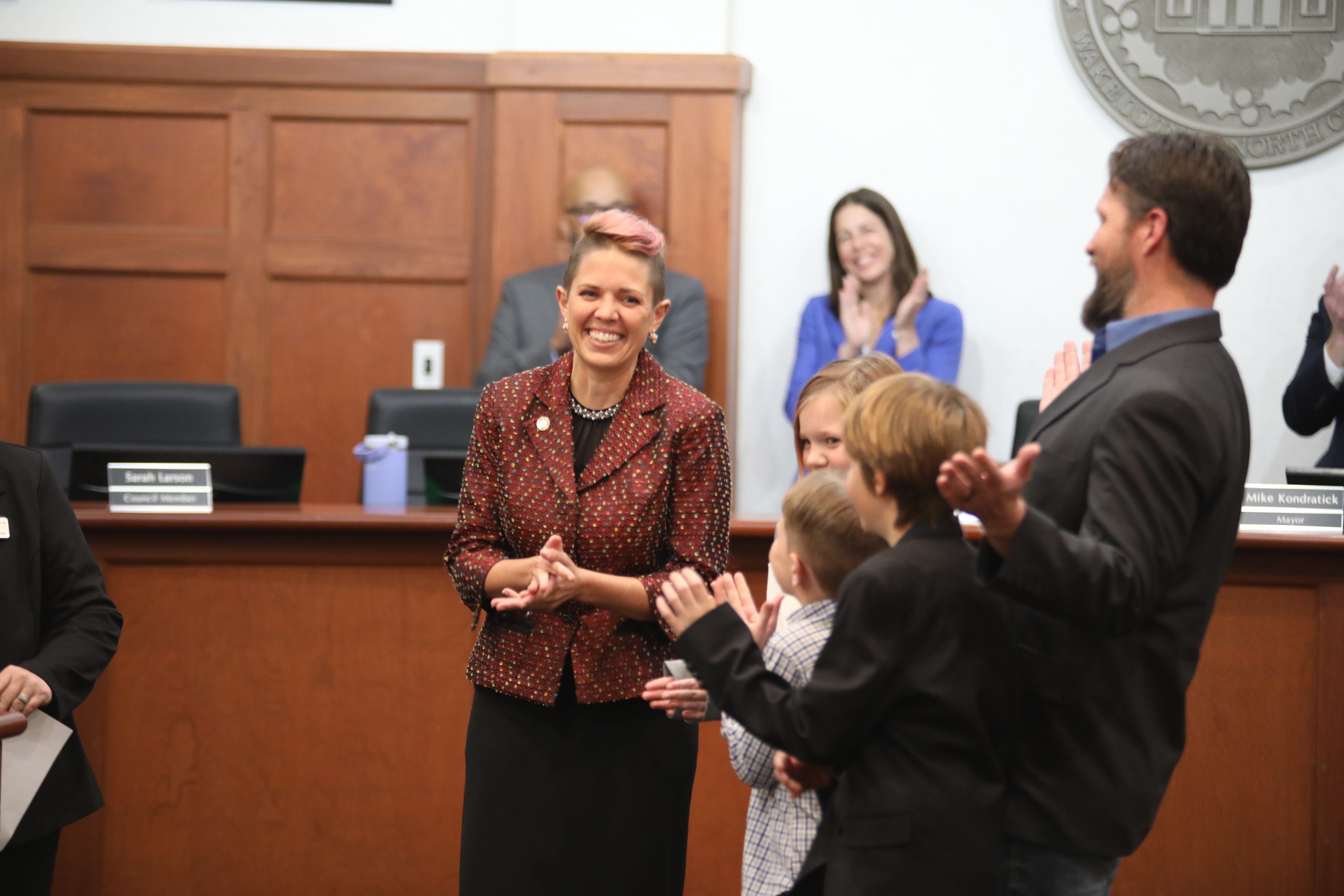 Following the outgoing officials’ remarks, Mayor-elect Mike Kondratick, re-elected council member Annie Drees, and newly elected council members Sarah Larson and Kara Foster took their oaths of office. The chamber remained standing-room only as each embraced the moment, many with family by their side.