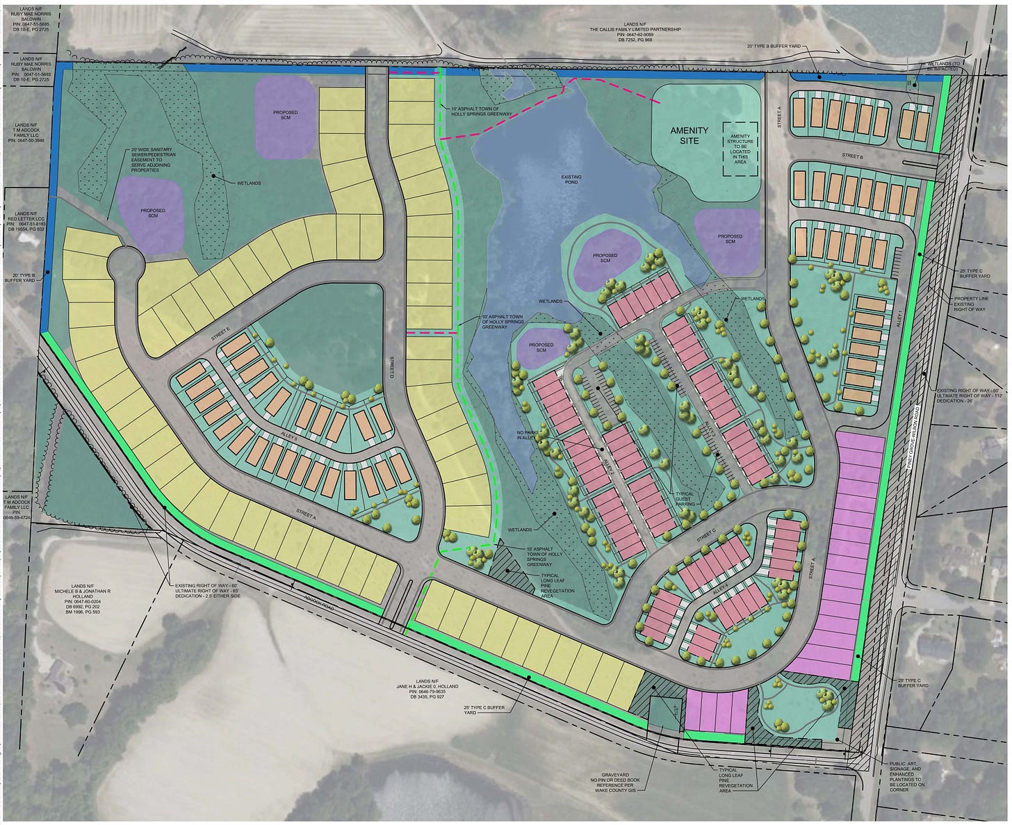 Bob Zumwalt, a landscape architect with Kimley-Horn, said the 81-acre site, about 77 acres of which are developable, includes a pond, wetlands, and mature trees that helped shape the layout. The plan, he said, retains much of the existing topography and natural features, provides a mix of lot sizes, and connects open spaces through sidewalks and trails.