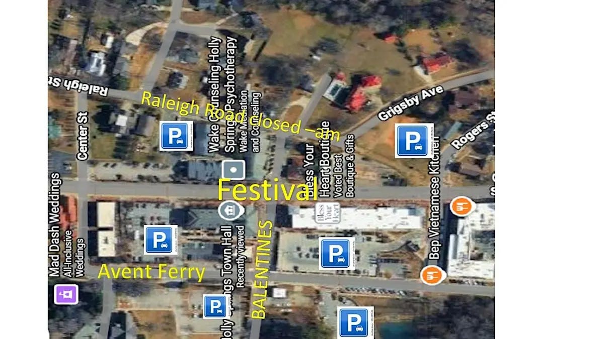 Parking: Race participants are encouraged to park at Womble Park and walk to downtown, as parking is limited during the festival. Festival parking will be available at Holly Springs Elementary School.