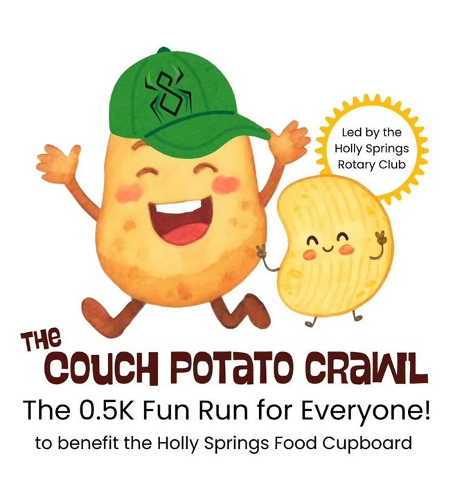 The Rotary Club’s “Couch Potato Crawl,” a playful nod to participation over competition, will also be part of the fun. Register for this half-mile fun run here. Proceeds will be used to support the Holly Springs Food Cupboard (website).