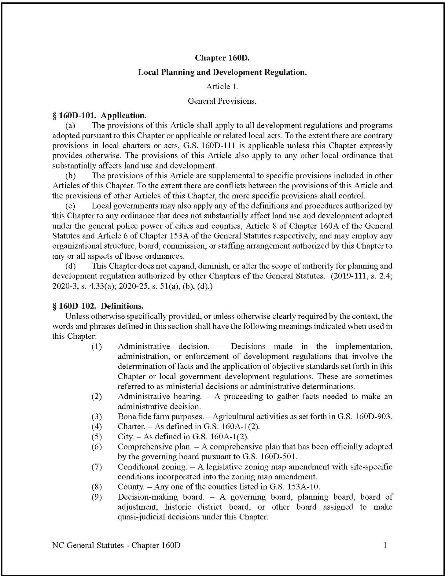 A plain-language look at how zoning, development approvals, and land-use decisions are regulated under NC State General Statute Chapter 160D.