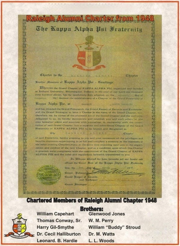 That foundation took shape locally on April 6, 1948, when ten men—William Capehart, Thomas Conway, Sr., Dr. Cecil Haliburton, Leonard B. Hardie, Harry Gil-Smythe, Glenwood Jones, W.M. Perry, William T. “Buddy” Stroud, Dr. M. Watts, and L.L. Woods—obtained a charter from the Grand Chapter to formally establish the Raleigh Alumni Chapter.