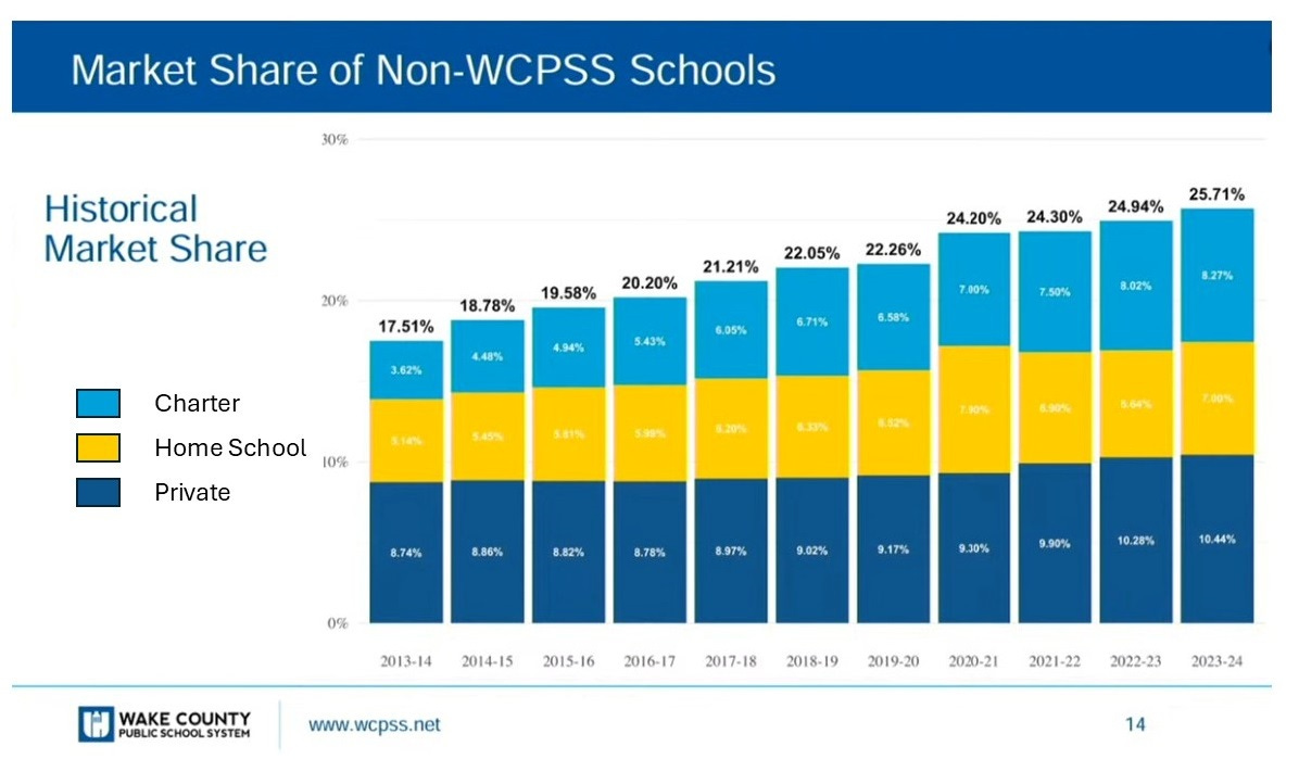 Currently, 25.7% of school-age children in Wake County attend non-WCPSS schools, a number that has been steadily increasing.